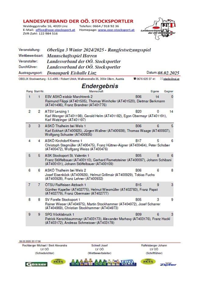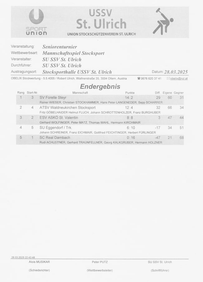 Die Moarschaft Obermair Alois, Dienstl Werner, Hoffmann Christian, Kaiser Franz und Moser Alfred setzte sich gegen die Moarschaft Haiberger Rudolf, Samwald Johannes, Draber Helmut, Wieser Rainer und Stockhammer Christian recht eindeutig mit dem Gesamtscore von 32 : 17 durch! Recht entspannt klang der Abend schließlich im Clubhaus aus!